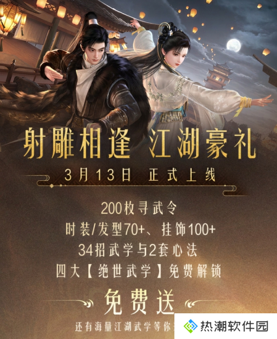 为庆祝《射雕》2.0版本正式上线,200枚寻武令、170+套外观、34招武学与2套心法免费送!四大绝世武学免费解锁,还有海量江湖武学等你探索!每一位踏入江湖的玩家都不用有外貌焦虑、数值压力,只需要玩得开心即可。