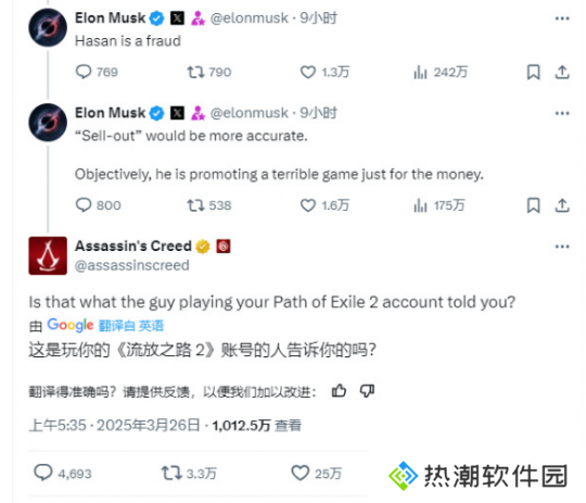 而一石掀起千层浪,这番话很快也引来了《刺客信条:影》官推账号的关注,后者攻击性十足的回复马斯克:“这是那个帮你玩《流放之路2》账号的人告诉你的吗?”